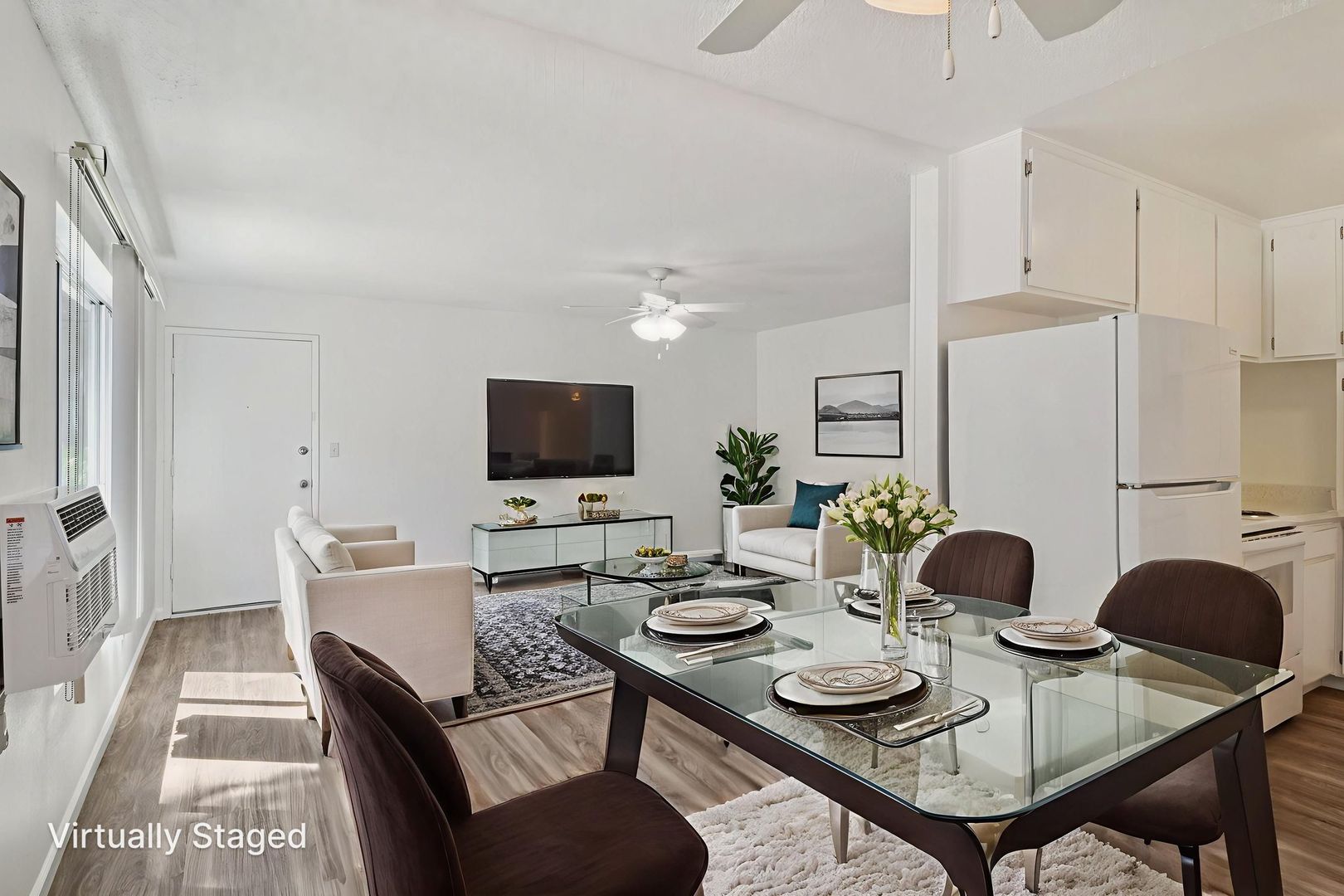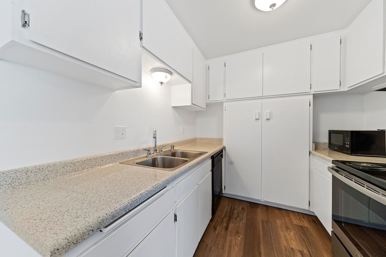 Our two-bedroom, two-bath apartment home interiors are large and comfortable, with air conditioning, pantry and cabinets, a walk-in closet, and custom window coverings. Easy access to the I-15, I-805, and I-8 freeways, bus and trolley for easy travel and commuting. Amenities include personalized, on-site management and maintenance service, a lap pool, garden-like landscaping, fitness center, saunas, barbeque, and laundry facilities.